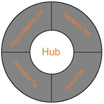 architecture consisting of Data Entry, Data Access, Calculation and Output tiers.